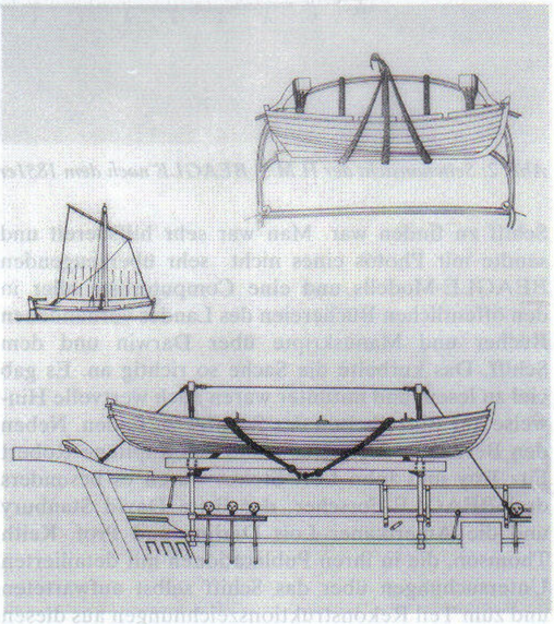 Abb. 4: Eine der vielen Detailzeichnungen, hier die Aufhängung der Dinghis und des 25 Fuß langen Walbootes.