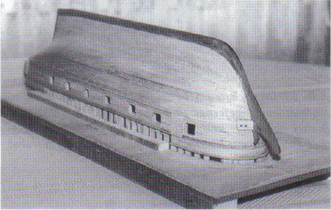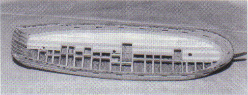 Abb. 9: Der so gefertigte Rumpf, hier von der Helling genommen, erhält die Innenbeplankung, die Spantköpfe werden auf entsprechende Länge geschnitten, die Mastspuren vorsorglich auf das Kielschwein geleimt und die Decksbalken gesetzt. Nachdem die Wassergänge gelegt sind, wird von der Mitte her das Dach beplankt.