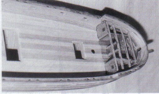 Abb. 8a: Ein weiterer Vorteil der Helling wird hier sichtbar. Der Spantkörper läßt sich nicht nur leichter beplanken und schleifen, man kann auch an diesem sehr genau die Oberkante der einzelnen Spanten, das Bergholz und die Stückpforten anzeichnen. Als Abschluß dieser Phase werden die sichtbaren Teile des Kiels und der Steven mit dem Körper verleimt und durch ein paar Holz. nägel gesichert.