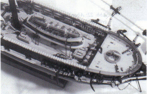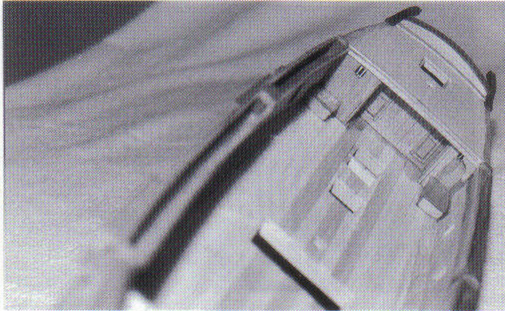 Abb. 11: Ein Gleiches geschah im Achterschiff. Über die ge setzten Kammerwände wurden die Decksbalken verlegt, dann erfolgte die Beplankung der Poop. Vor den Kammern befinden sich auf dem Oberdeck Flaggenkästen. Alles später nicht mehr Erreichbare wird gleich lackiert. Desweiteren er kennt man auf dem Foto auch bereits die Schandeckel mit den aufgesetzten Hängemattenkästen.