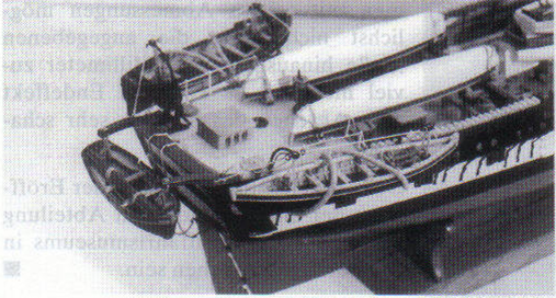 Abb. 12: Von der Seite sieht das dann so aus. Ebenfalls sichtbar sind die Kranbalken, die Heckdavits, die Rüsten und die Fallreepstufen.